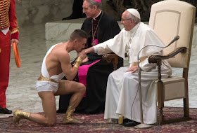 Sin embargo, permitió a un semi desnudo varón artista de circo besar profusamente su anillo el 7 de febrero de 2018.