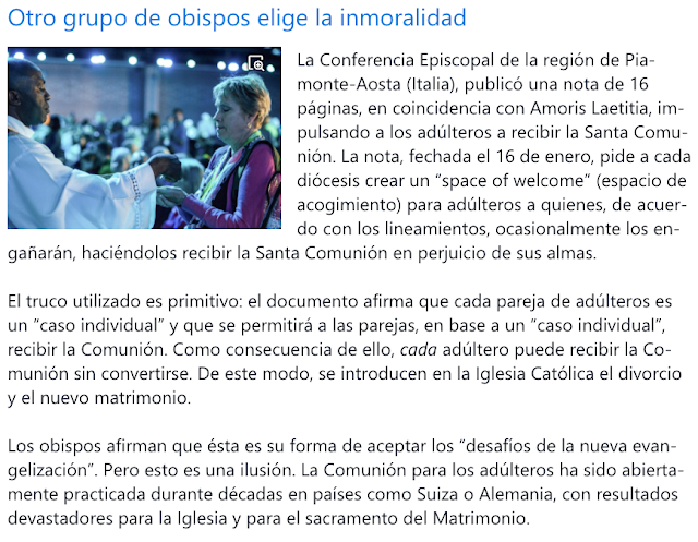 - La comunión para los adúlteros es herética: la arquidiócesis de Braga en Portugal, los obispos de Malta y Alemania, y los obispos de Buenos Aires que recibieron apoyo de Francisco, están obvia y seriamente equivocados al conceder la comunión a los adúlteros, escribe el abogado canonista Edward Peters en su blog. Peters nota que los argumentos son conocidos. Su conclusión - cita - es: "Tenemos razón en este punto y ellos están equivocados".